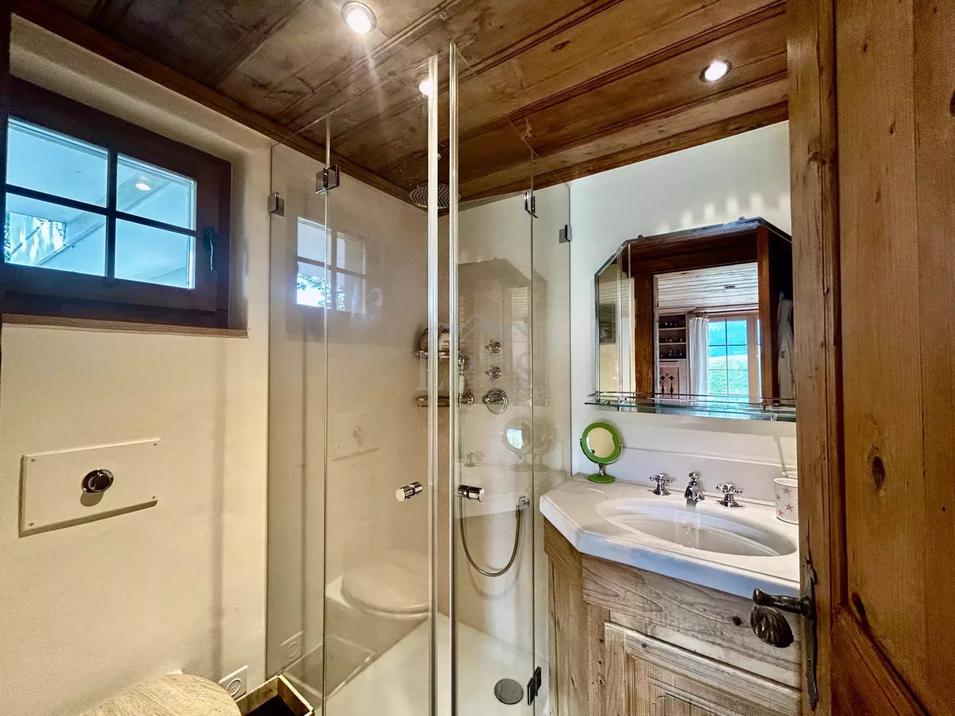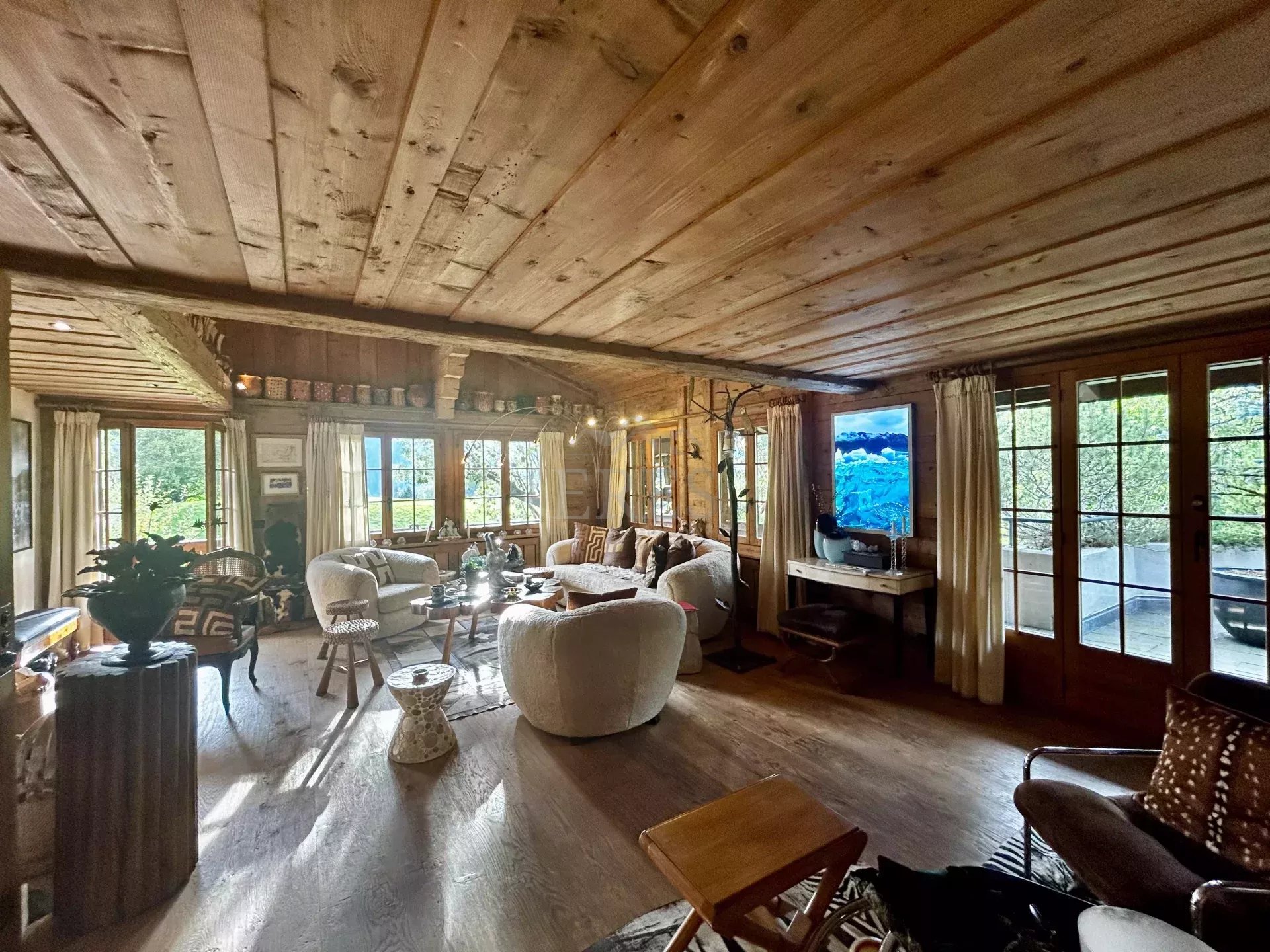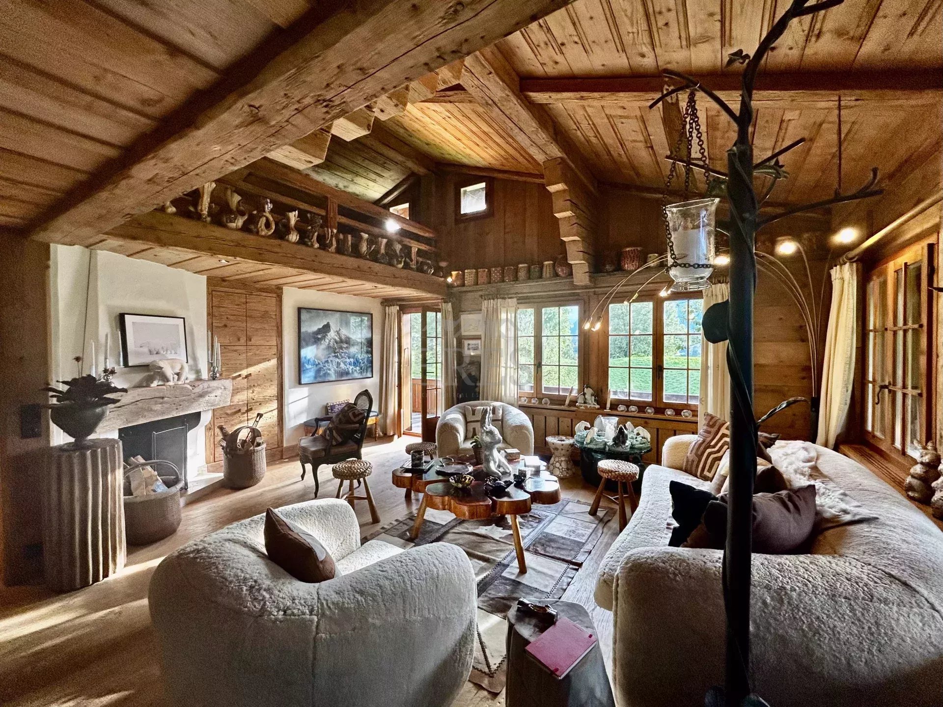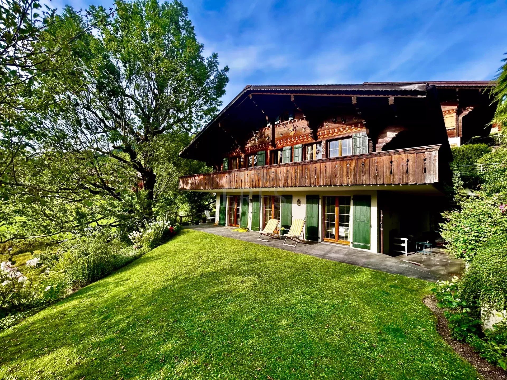 The chalet is composed by a large sitting room with a chimney piece, an open fully equipped kitchen with a large dining table, 5 bedrooms and 5 bathrooms (3 of which en suite) along with a spacious balcony and terrace opening on a fenced garden. A closed garage and an open parking space complete the property.