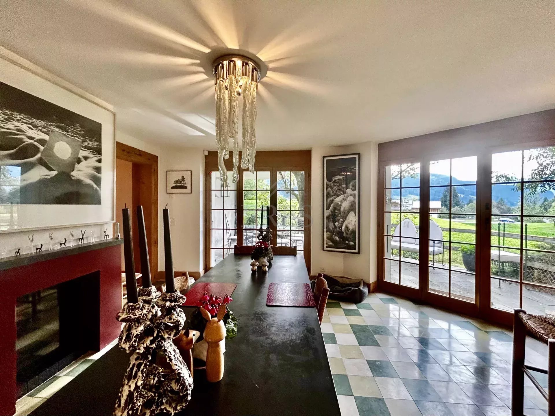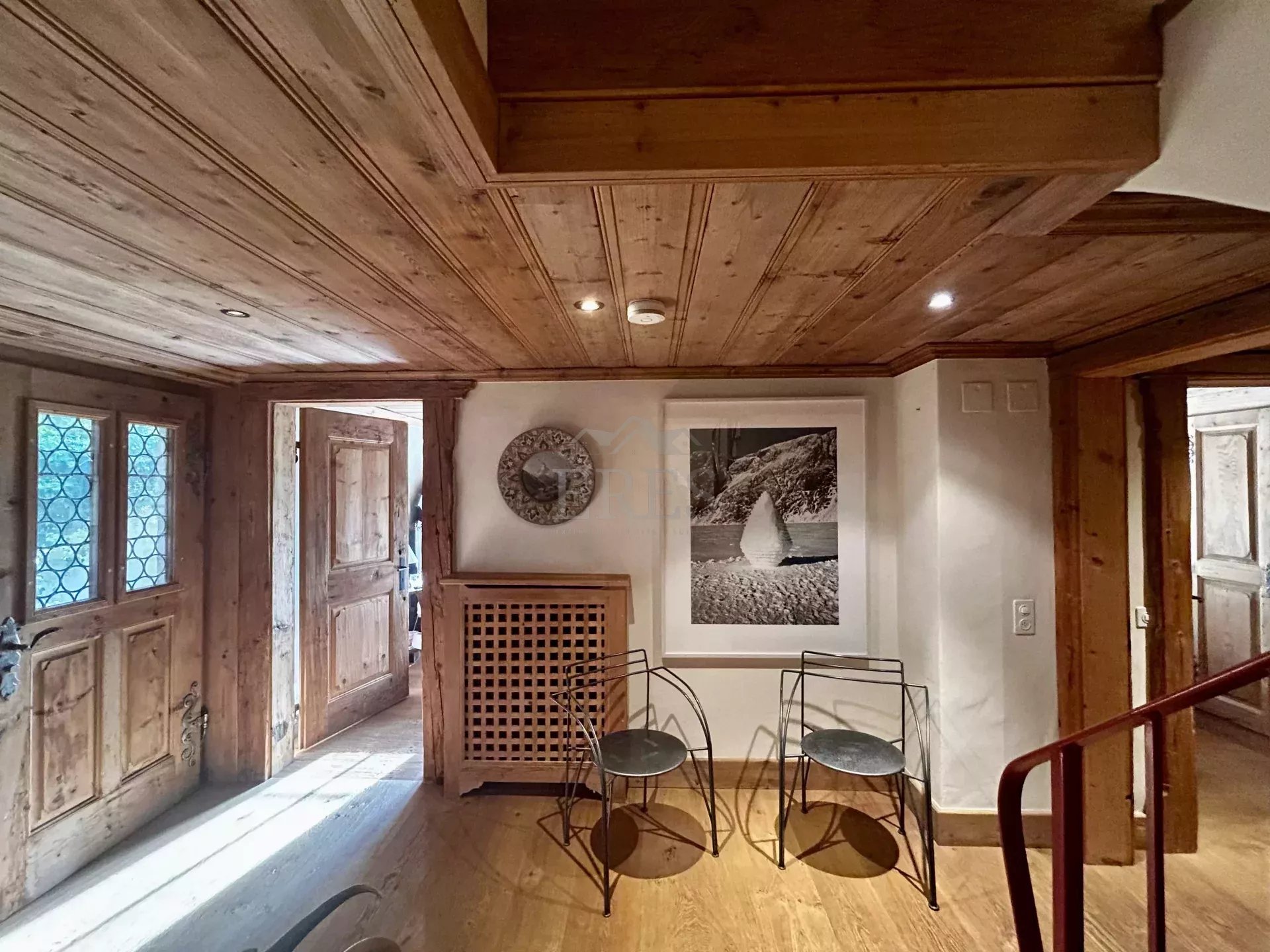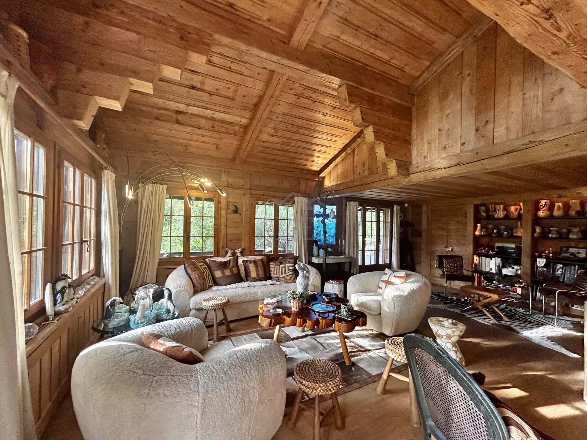 The chalet is composed by a large sitting room with a chimney piece, an open fully equipped kitchen with a large dining table, 5 bedrooms and 5 bathrooms (3 of which en suite) along with a spacious balcony and terrace opening on a fenced garden. A closed garage and an open parking space complete the property.