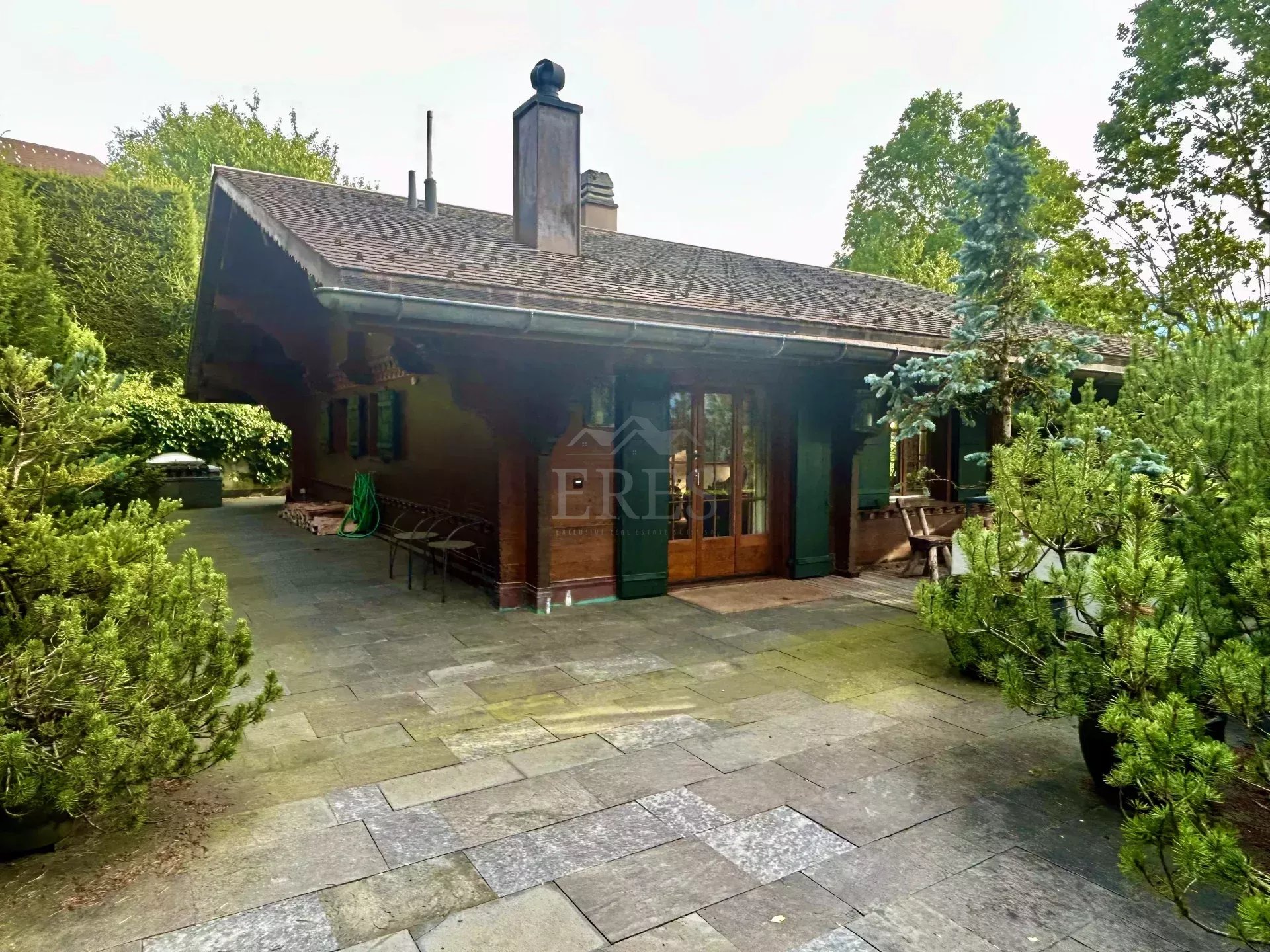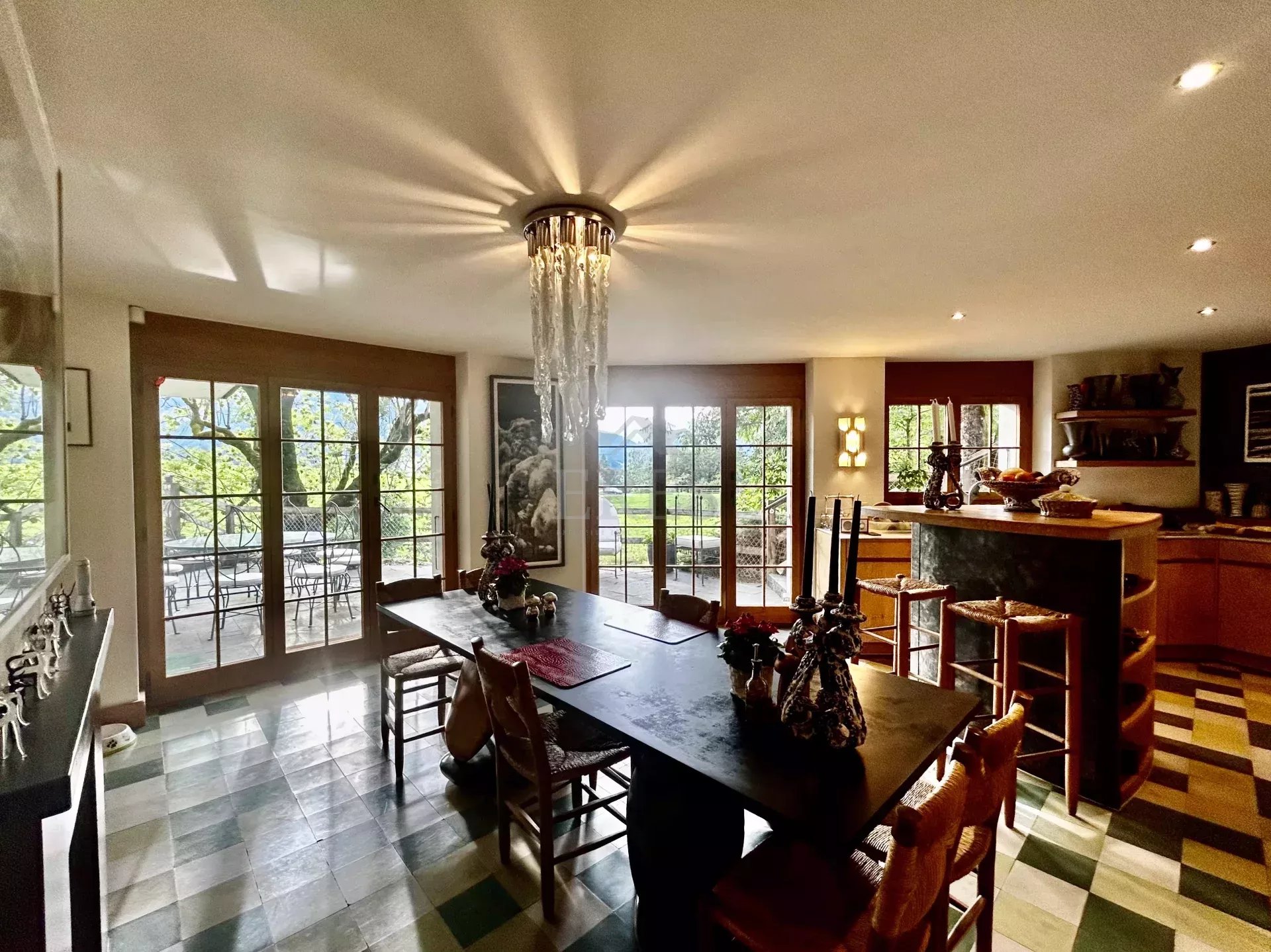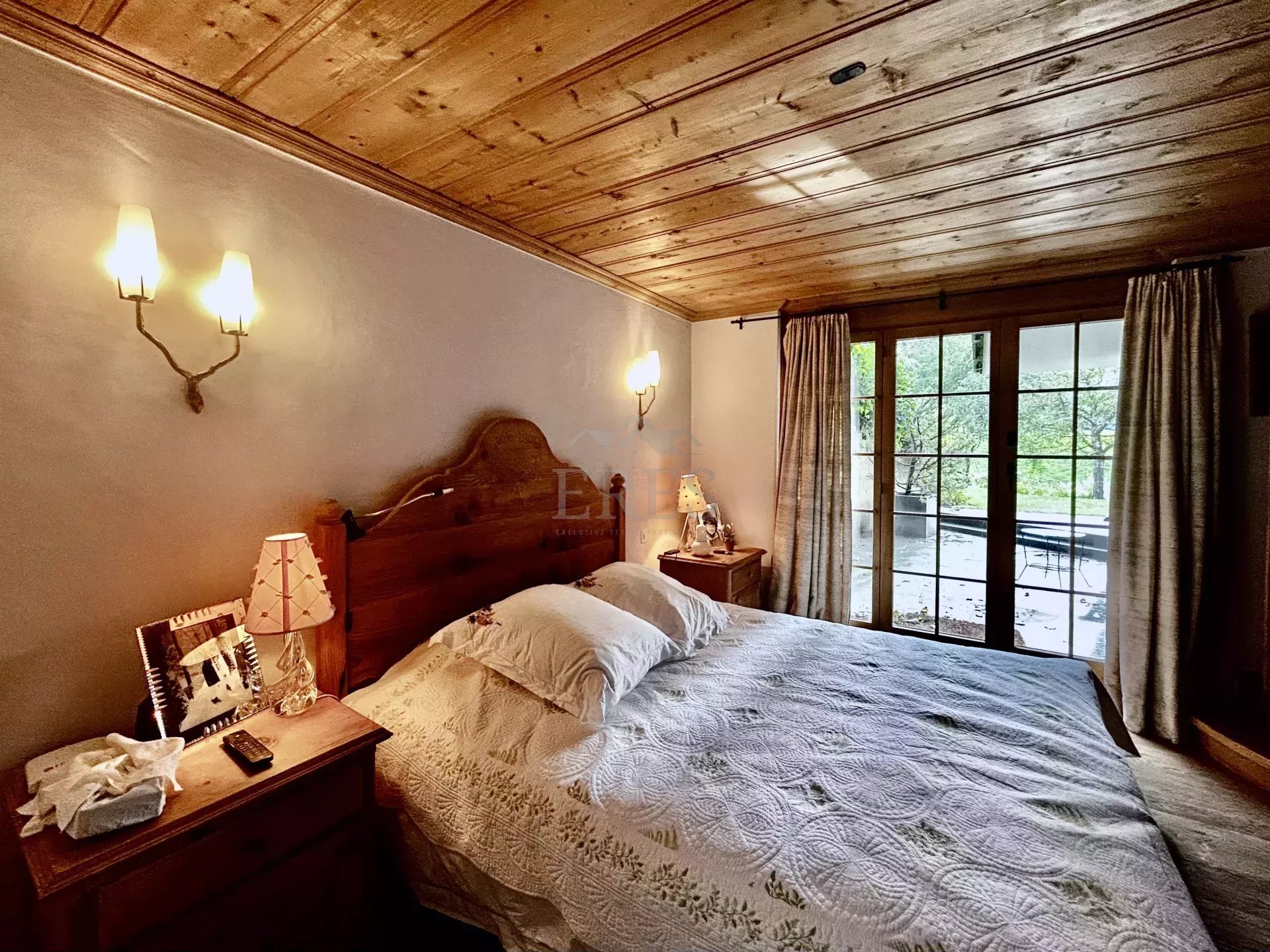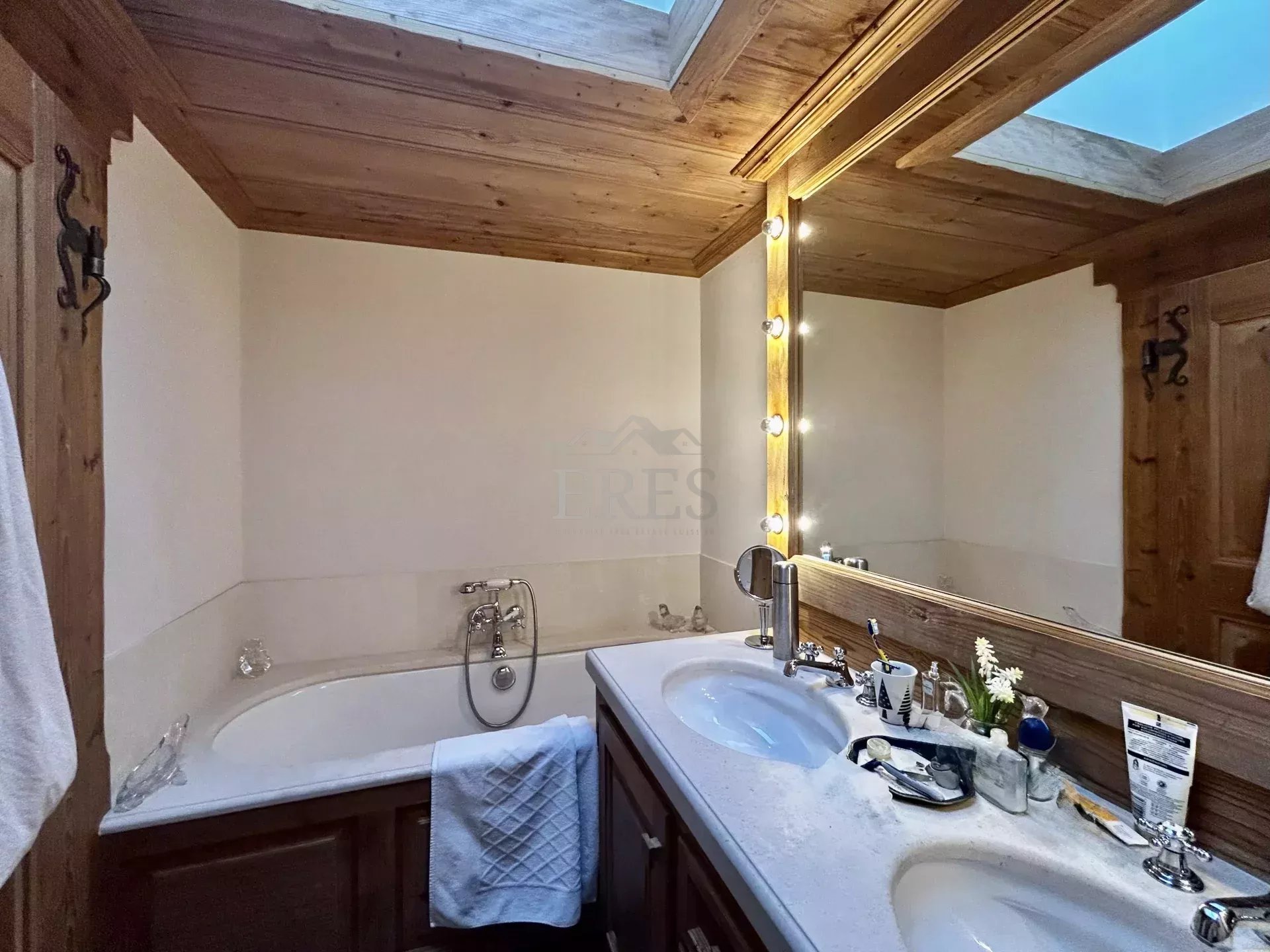 The chalet is composed by a large sitting room with a chimney piece, an open fully equipped kitchen with a large dining table, 5 bedrooms and 5 bathrooms (3 of which en suite) along with a spacious balcony and terrace opening on a fenced garden. A closed garage and an open parking space complete the property.